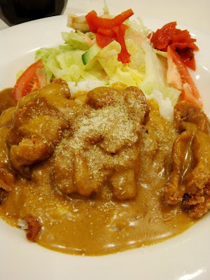 -> The word 'cheese' and 'curry' have become a common compound word nowadays - seems like the Japanese always mix cheese and curry these days. Ah, but the question is, what type of cheese to mix with the curry? I've tasted many cheese curries - from curries baked with shredded mozzarella or curries with chunks of feta in it (Ew!?!). This karaage cheese curry is simply karaage curry sprinkled with powdered parmesan. Kind of uninspired but it does the job - the curry indeed becomes cheesy (pardon the pun).